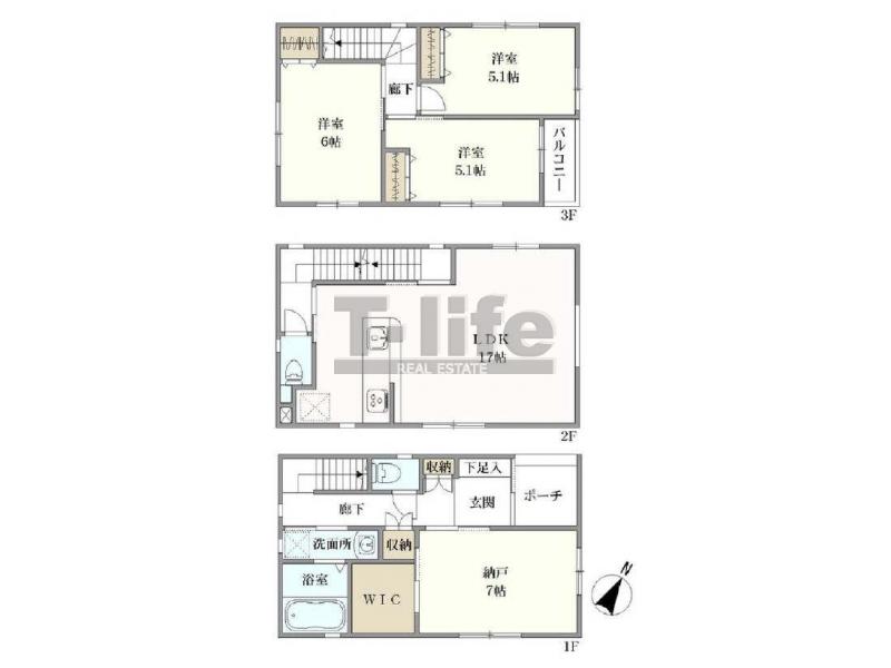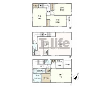 | 間取詳細 | 1F:納戸7.0 2F:LDK17 3F:6洋、5.1洋、5.1洋 | ||