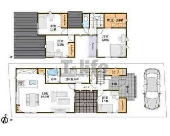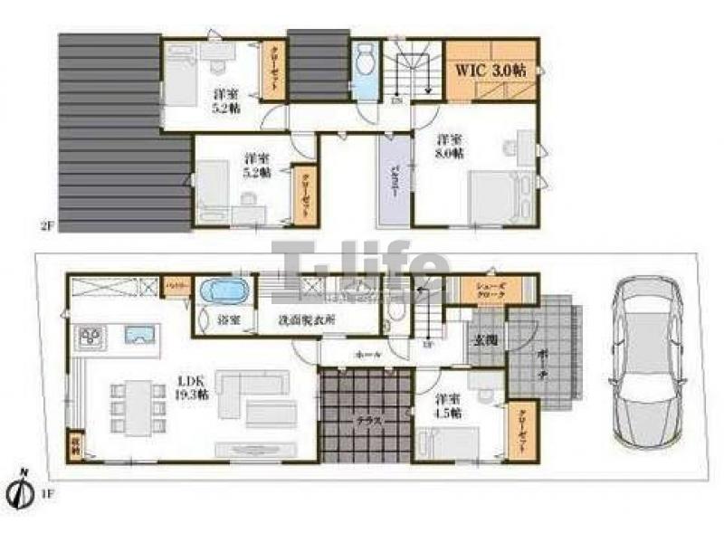 | 間取詳細 | 1F:LDK19.3、4.5洋 2F:8.0洋、5.2洋、5.2洋、3.0WIC | ||